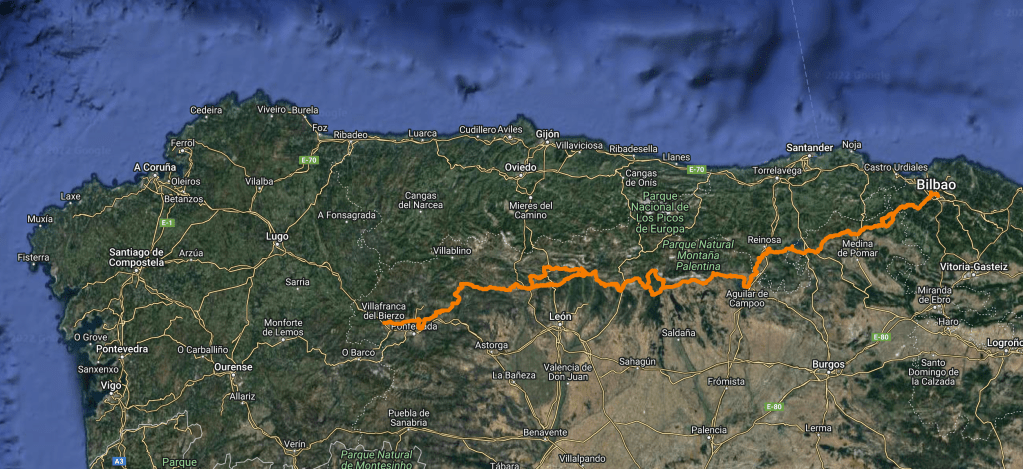 El Camino Olvidado comienza en Bilbao, País Vasco y pasa por Burgos, donde se atraviesan bosques y cascadas impresionantes. En Palencia pasará por impresionantes iglesias románicas que acogieron a peregrinos en el pasado. Luego, en León, atravesarás más paisajes hermosos y varios parques nacionales. La ruta continúa a través de tranquilos valles para llegar a la impresionante comarca de El Bierzo y a la localidad de Villafranca, conocida como la «Villa Francesa» debido a la afluencia de peregrinos franceses que visitaron el monasterio cluniacense de este lugar a finales del siglo XI. Desde aquí se une al Camino Francés a Santiago de Compostela.